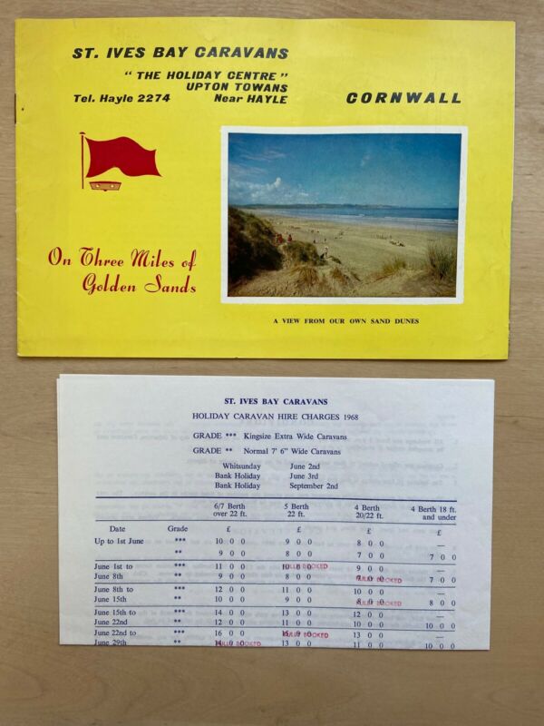 Title (ebay affiliate link): St. Ives Bay Caravans Hayle Cornwall Holiday Brochure 1968 with Price List