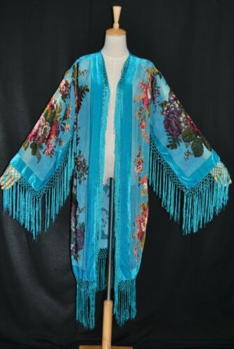 Title (ebay affiliate link): Art Classic Turquoise Eastern Flower Burnout Velvet Fringe Jacket Kimono Coat
