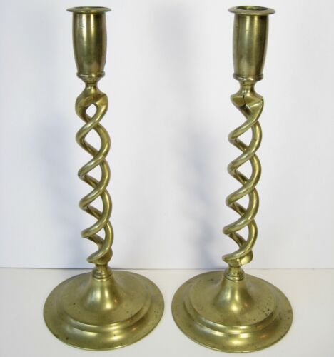 Pair Antique English Brass Double Barley Twist Candlesticks ~ Solid Stems ~12 In