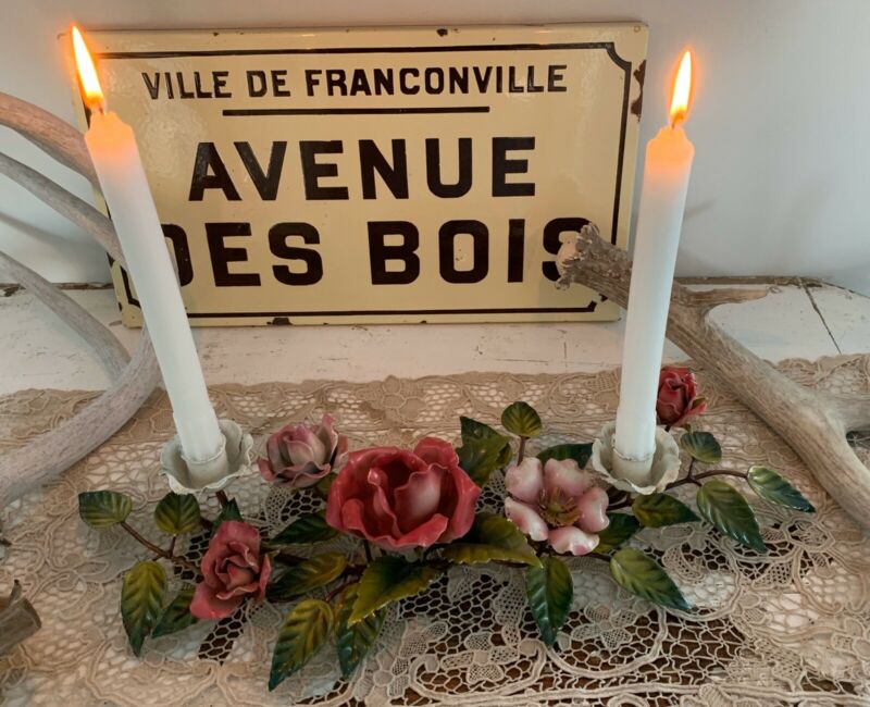 Vintage Toleware Candlestick Candle Holder Italian Tole Roses Magnolia