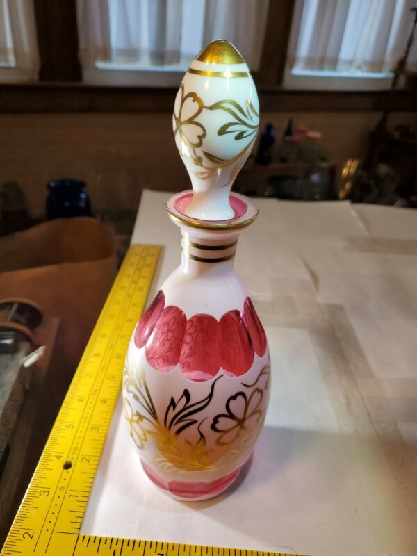 Antique White Cut to Cranberry Glass Decanter with gold painted floral & Stopper
