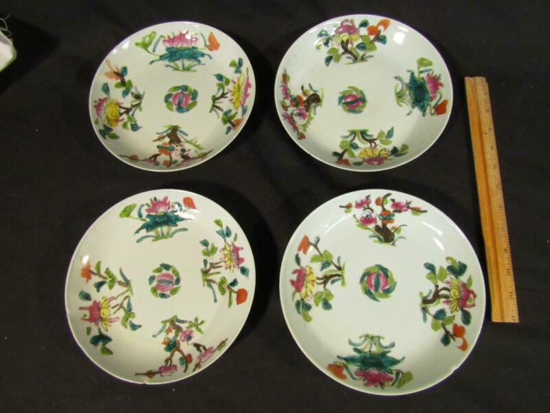 SET 4 ANTIQUE CHINESE EXPORT CELADON FAMILLE ROSE 8.5" SHALLOW BOWLS