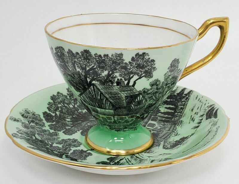 Vintage Taylor & Kent Bone China Tea Cup Saucer Rural England 7089B Green Black