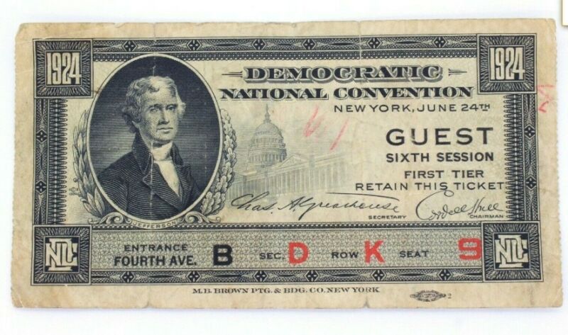 Title (ebay affiliate link): 1924 Democratic National Convention Guest Ticket Sixth Session You Grade