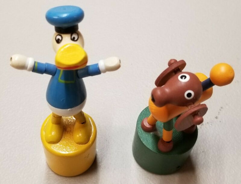 VINTAGE WOODEN THUMB PUSH UP PUPPETS OLD FASHION DONALD DUCK & DOG