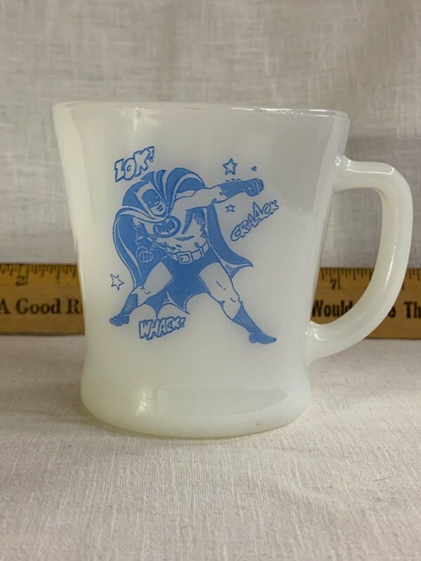 Vintage 1960''s Anchor Hocking Fire King BATMAN Milk Glass Coffee Cup Mug BLUE