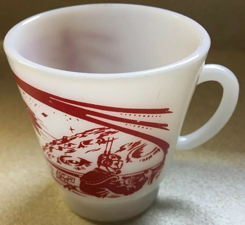 Vintage Spaceship, UFO, Interplanetary, Milk Glass Mug Cup Hazel Atlas Red