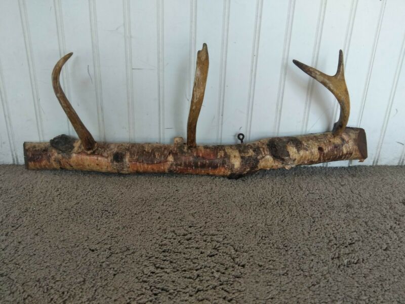 Title (ebay affiliate link): Primitive Vintage Antique Adirondack Cabin 3 Antler Birch Bark Hat Coat Rack