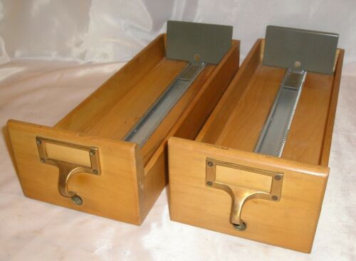Title (ebay affiliate link): TWO Vintage Library Card Catalog File Cabinet Wood Drawers - Brass Pulls - 17"
