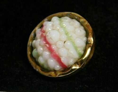 Antique Vtg BUTTON Small Bumpy Milk Glass in Brass w Stripes NICE! #27M