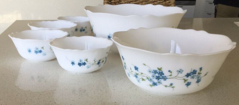 Title (ebay affiliate link): 6 PIECE MILK GLASS - ARCOPAL FRANCE - ''VERONICA''-''MYSOSOTIS'' BLUE FORGET-ME-NOTS