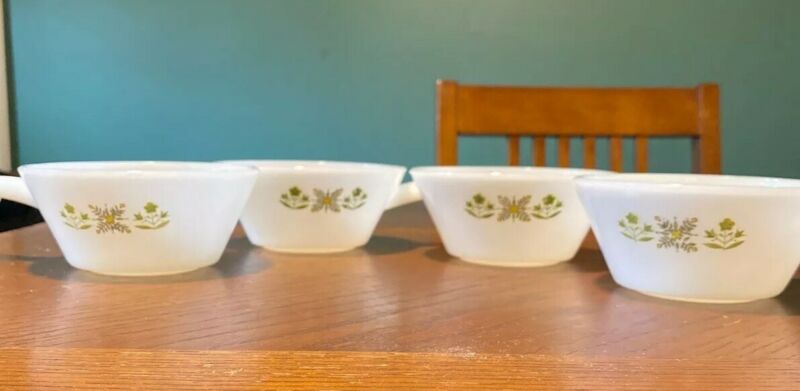 Title (ebay affiliate link): VINTAGE FIRE KING HANDLED BOWLS MEADOW GREEN ON MILK GLASS SET OF 4 NICE ! 8 Oz