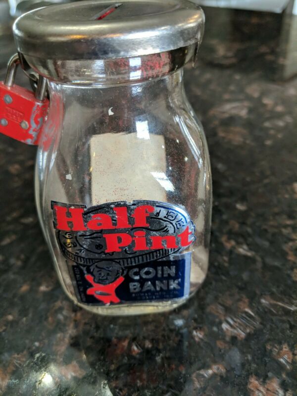 Title (ebay affiliate link): Antique Half Pint Coin Bank Milk Glass Jar Metal top Vintage Bower Goshen Ind