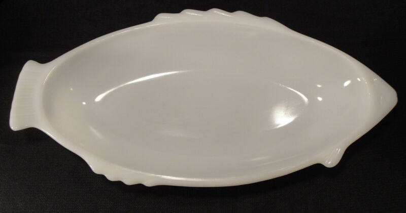 Title (ebay affiliate link): GLASBAKE Fish Serving Bowl White Milk Glass Large Platter 17.75" USA 4141 VTG