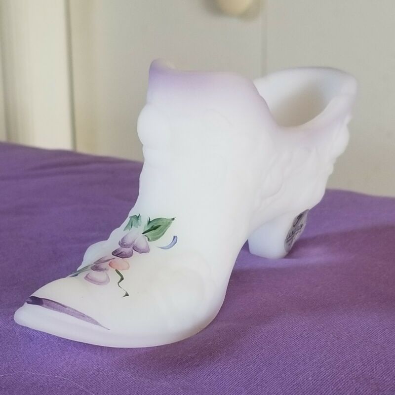 Title (ebay affiliate link): Fenton Art Glass Hand Painted and Artist Signed White Satin Milk Glass Shoe.