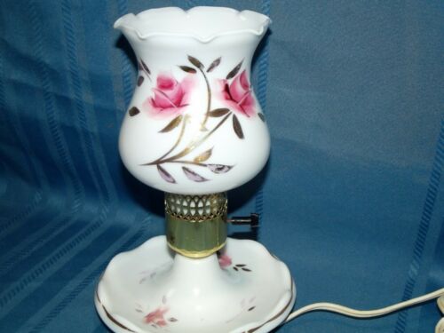 Vintage milk glass electric small hurricane lamp asian floral painted shade desk