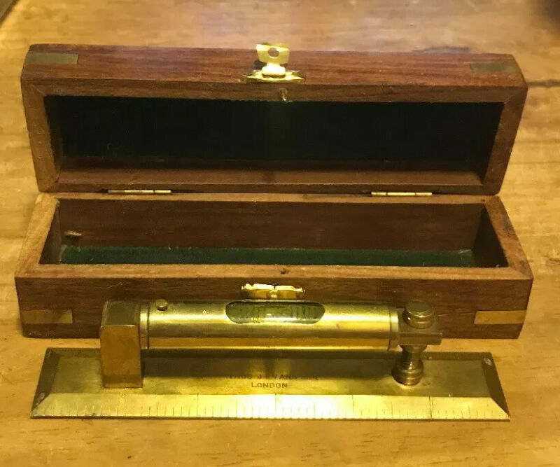 Title (ebay affiliate link): Vintage Thomas J. Evans London Solid Brass Spirit Level in Wooden Case