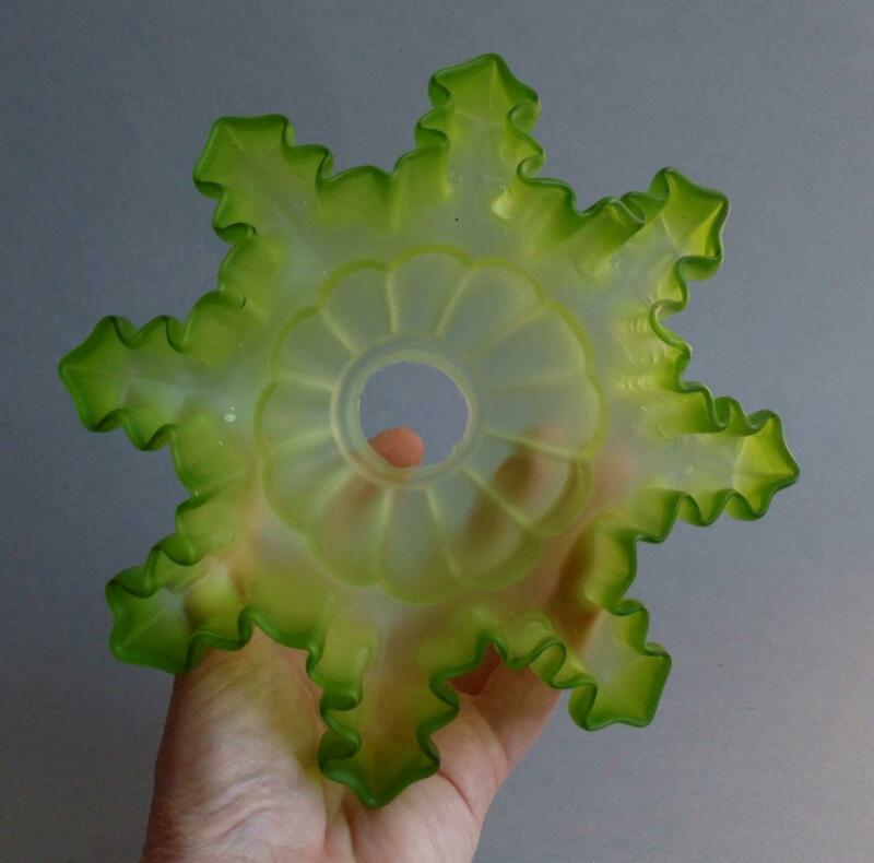 Title (ebay affiliate link): Antique FRILLY EDGED Graduated GREEN GLASS French LAMPSHADE 1930s Art Deco