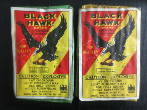 Title (ebay affiliate link): FIRECRACKER ADVERTISEMENT LABEL 2 BLACK HAWK ICC MACAU 1 1/2" 16S GREEN AND GOLD