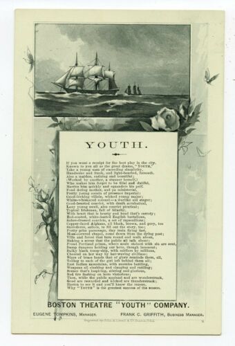 Title (ebay affiliate link): 1883 THEATRE PLAY VICTORIAN TRADE CARD POEM YOUTH AT OPERA HOUSE HARTFORD
