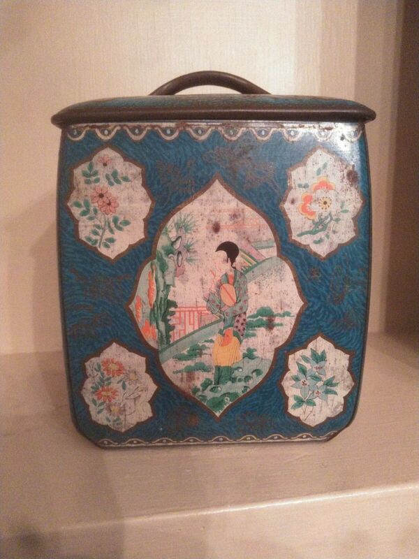 Title (ebay affiliate link): Vintage Tea Tin Box Asian Oriental Inspired Graphics BEAUTIFUL SHAPE AND DESIGN
