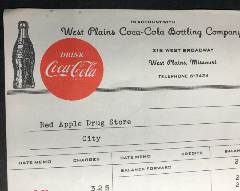West Plains Missouri Coca Cola Soda Pop Color Billhead Red Apple Drug Store