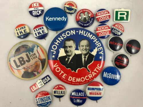 Title (ebay affiliate link): Vintage Lot Of 21 Campaign Buttons - Ike; Nixon; Kennedy; LBJ; etc.