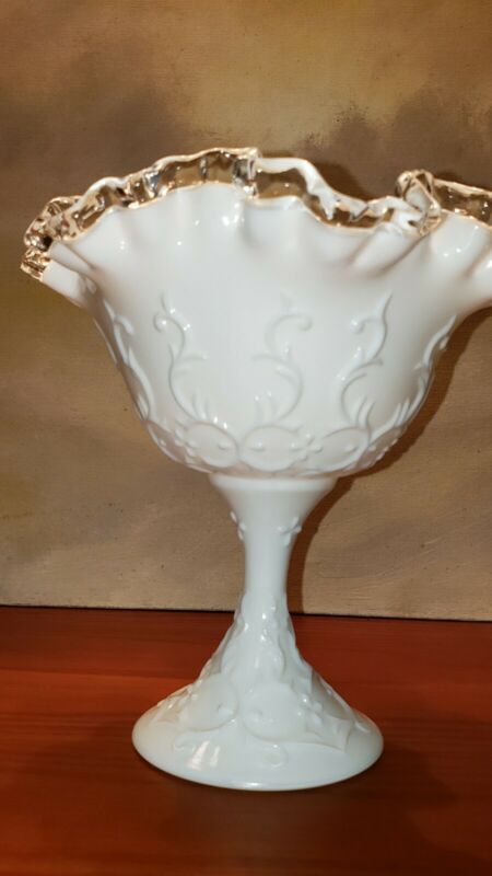 Title (ebay affiliate link): Fenton Silver Crest Compote Bowl White Milk Glass with Clear Ribbon