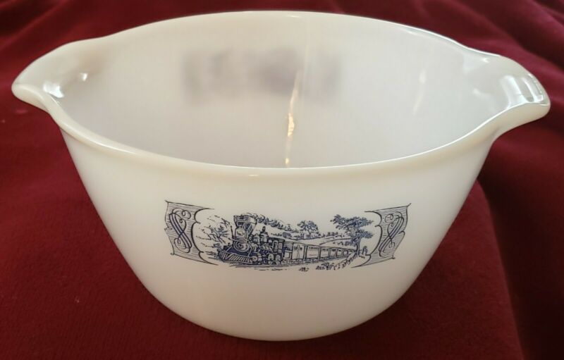 Title (ebay affiliate link): Currier and & Ives Milk Glass Blue Train Mixing Bowl Locomotive Railroad perfect