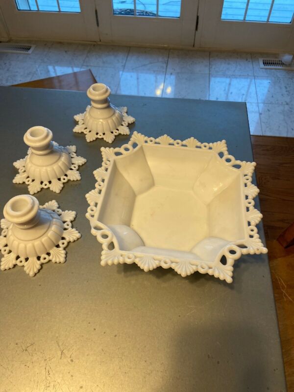 Title (ebay affiliate link): Westmoreland Milk Glass Ring & Petal Lace Edge 10" Square Serving Bowl Wedding