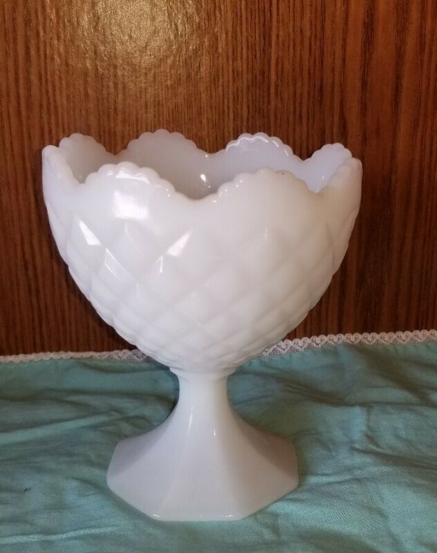 Title (ebay affiliate link): Vintage NAPCO White Milk Glass Scalloped Quilted Footed Compote Bowl Vase Goblet