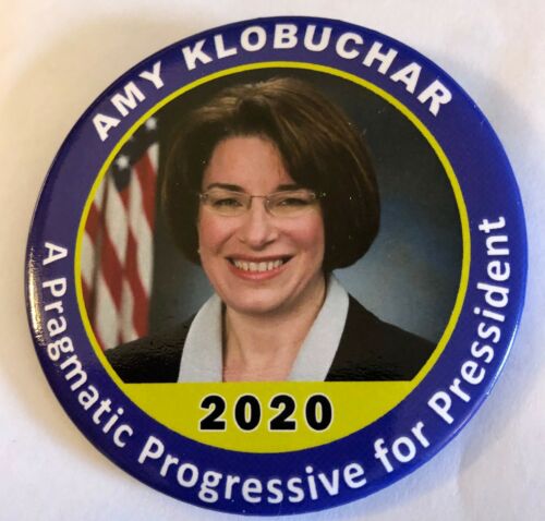 Title (ebay affiliate link): 3" Amy Klobuchar A Pragmatic Progressive for Presidential Political Campaign Pin