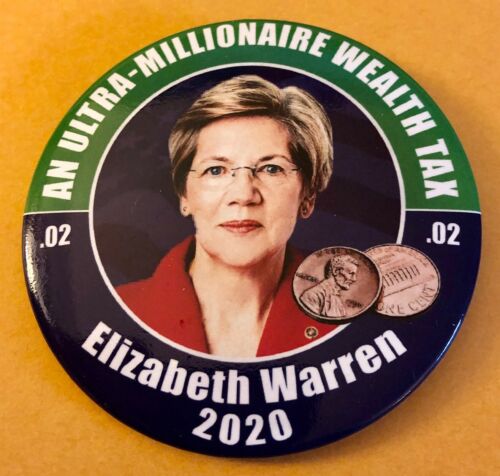 Title (ebay affiliate link): 3" Elizabeth Warren 2020 "An Ultra-Millionaire Wealth Tax .02" Campaign Pinback