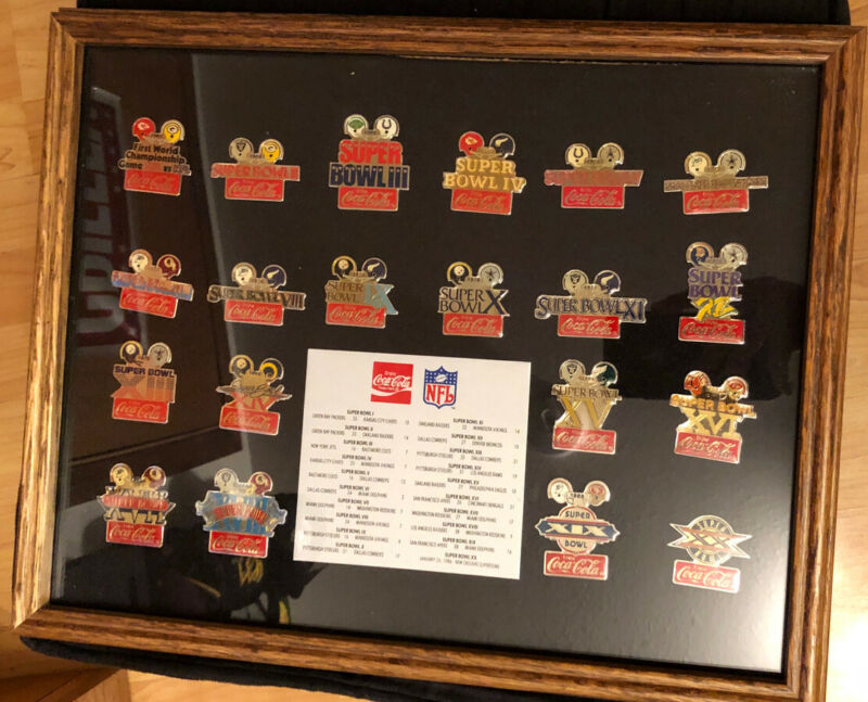 Title (ebay affiliate link): Coca-Cola NFL Super Bowl, 20 Piece Framed Collectors Pin Set - Very Good Shape
