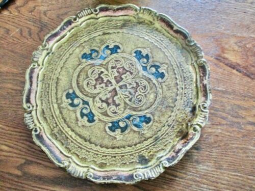 Title (ebay affiliate link): Vintage Hand Painted Gold Florentine Toletray Blue Red Scrolls 13" Round