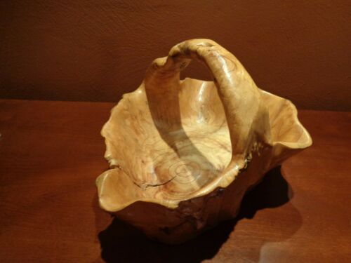 Vtg Hand Carved Burl Wood Basket w/handle Birdseye Birch 13 x 13