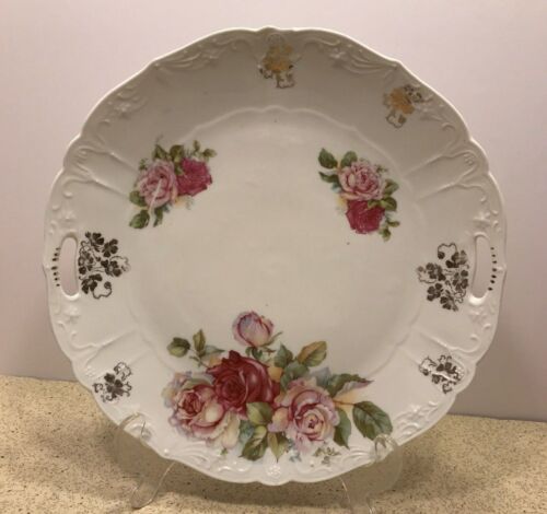 Vintage Porcelain Cake Plate Serving Platter - Pink Roses & Gold Trim on White