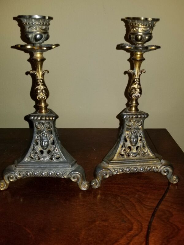Title (ebay affiliate link): REDUCED -Set of 2 Gothic candlesticks8 3/4 inches tall splash of gold metal