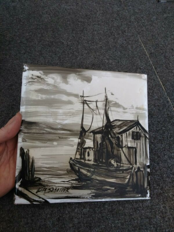 Title (ebay affiliate link): Vintage Hand Painted Signed Original Art Tile Seascape Boat Shack ONDA SPAIN