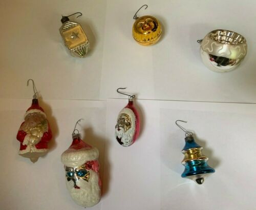Seven 7 Christmas Ornaments Pre1946 Vintage 3 Santas Gold Sun Shiny Indent Etc.