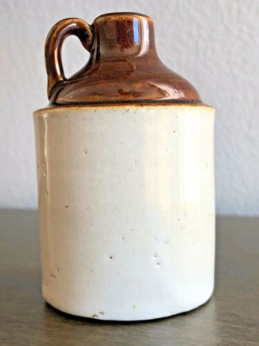 Antique Miniature Brown Top Pottery Crock Whiskey Jug Handle Vintage Two Toned