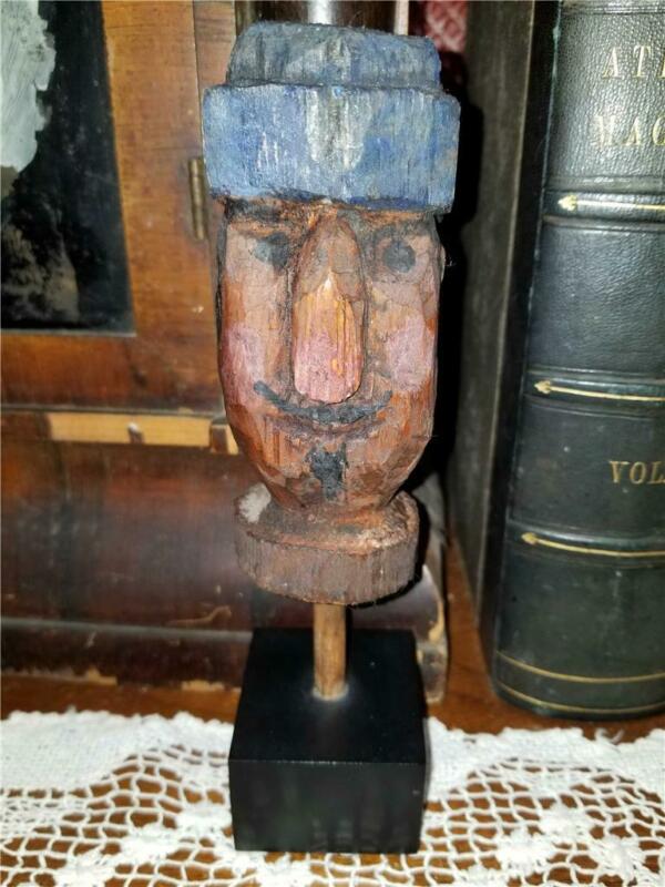 Title (ebay affiliate link): Antique Vtg Primitive Hand Carved Folk Art Face Statue Man Big Nose Hat On Stand