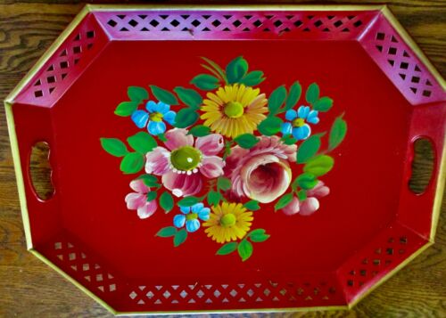 Title (ebay affiliate link): Hand Painted RED Tole Tray Vintage Nashco NY Flower Reticulated Edge Hand Holes