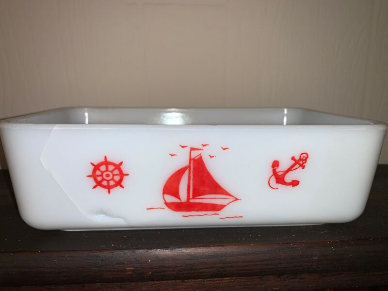 Title (ebay affiliate link): Vintage Red McKee SAILBOAT Milk Glass Refrigerator Dish Rectangular 1930-40s