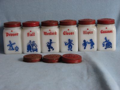 6 VINTAGE TIPP CITY DUTCH DOVE MILK GLASS SPICE JARS