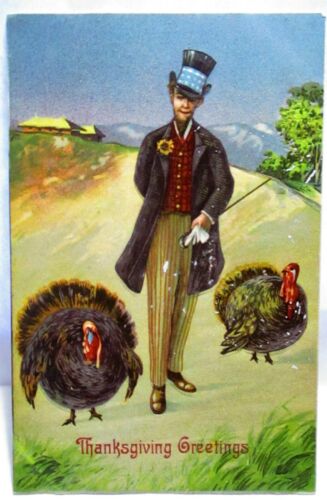 Title (ebay affiliate link): 1908 POSTCARD THANKSGIVING GREETINGS, MAN WITH CANE WALKING WITH 2 TURKEYS