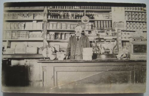 Title (ebay affiliate link): General Store Interior Old 1910-20s RPPC Postcard; Man; Lots of Shelves; No ID