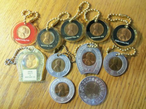 Title (ebay affiliate link): 11 VINTAGE ENCASED PENNIES, EMBEDED COINS, COIN KEYCHAINS, US COINS ENCASED