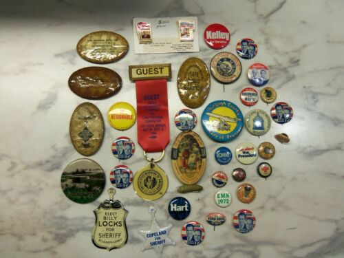 Title (ebay affiliate link): ANTIQUE, VINTAGE CELLULOID ADVERTISING JUNK DRAWER LOT PINBACKS, MIRRORS, ETC.