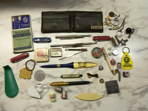 Title (ebay affiliate link): ANTIQUE, VINTAGE, JUNK DRAWER LOT ADVERTISING ITEMS DICE TINS POCKET KNIFES ETC.